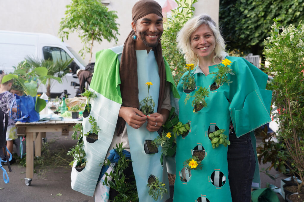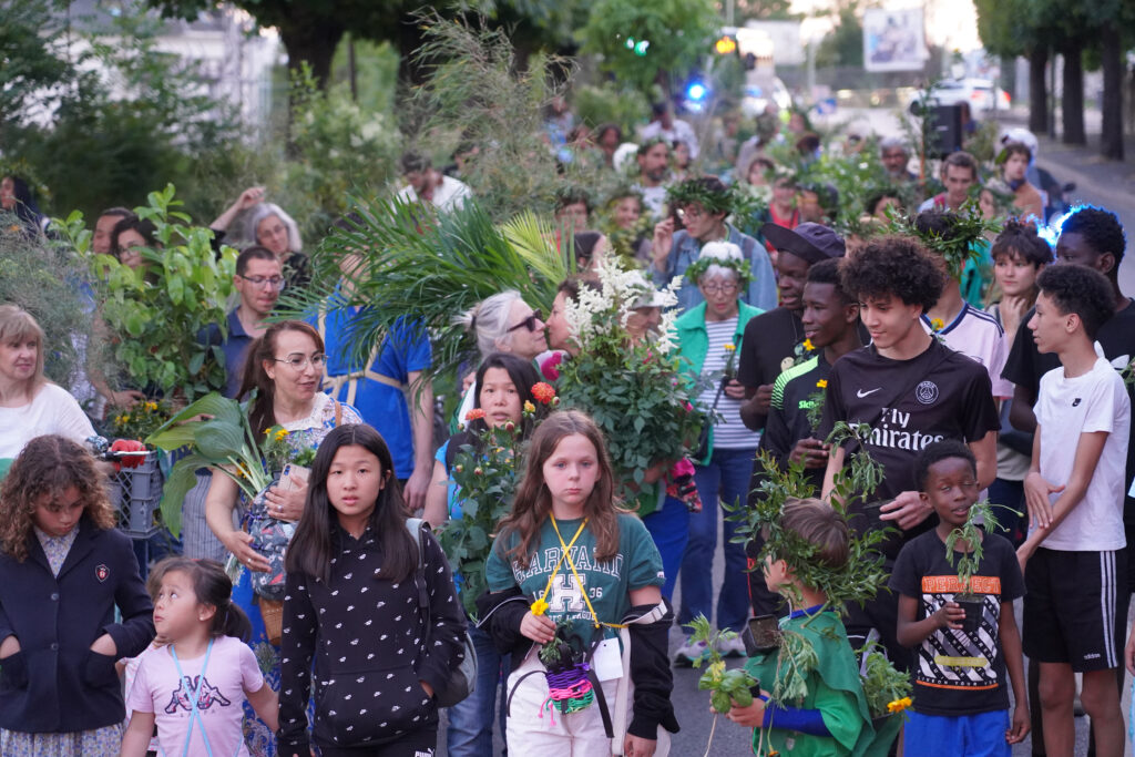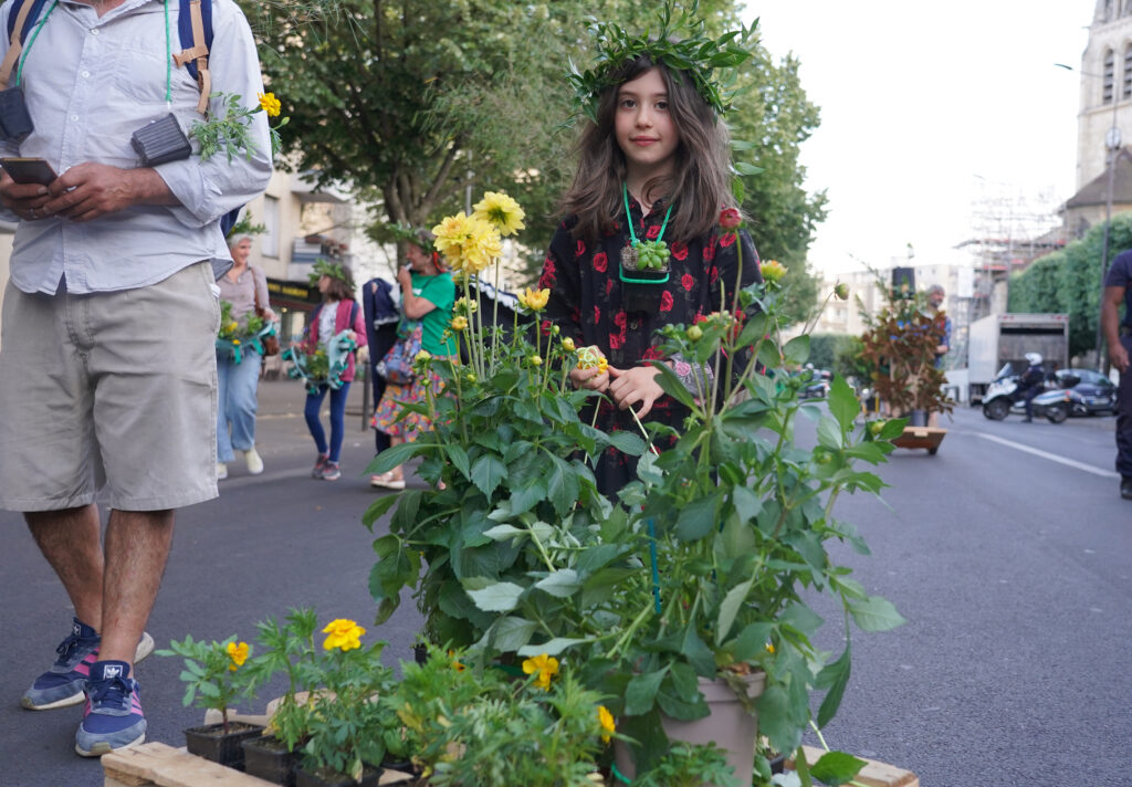 We met at Place du Marché and walked towards the Seine river to L’Atelier des Ardoines where the plants were then planted. The sound collective l’Emoi Sonneur accompanied the walk and staged a sound piece with live musicians for an “assembly of the living” on our arrival. There, we shared a beautiful meal with food grown locally, drinks, music, and a photographic studio of plant and human participants by Marie Hudelot.